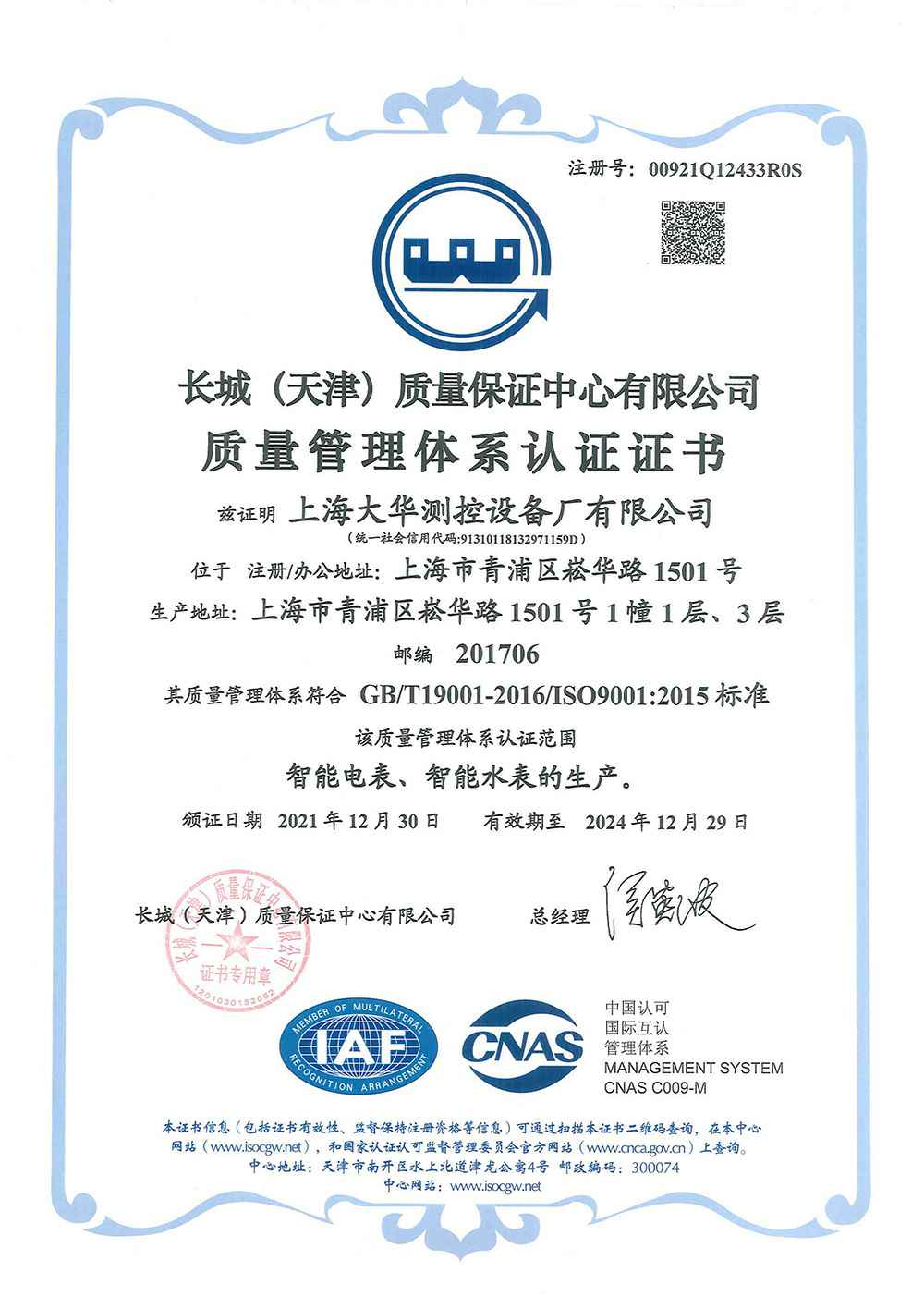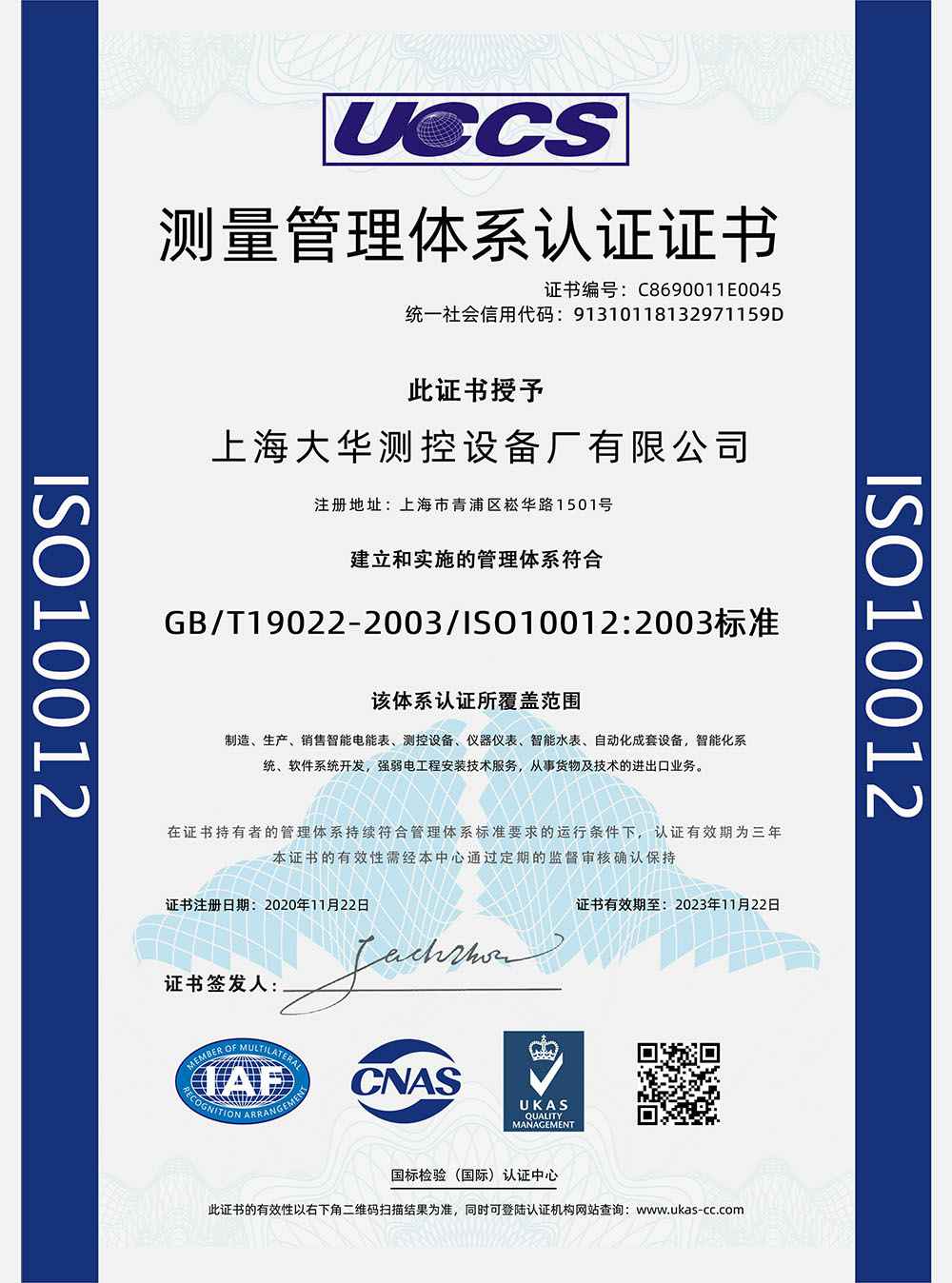 2020年 UCCS测量管理体系认证证书;